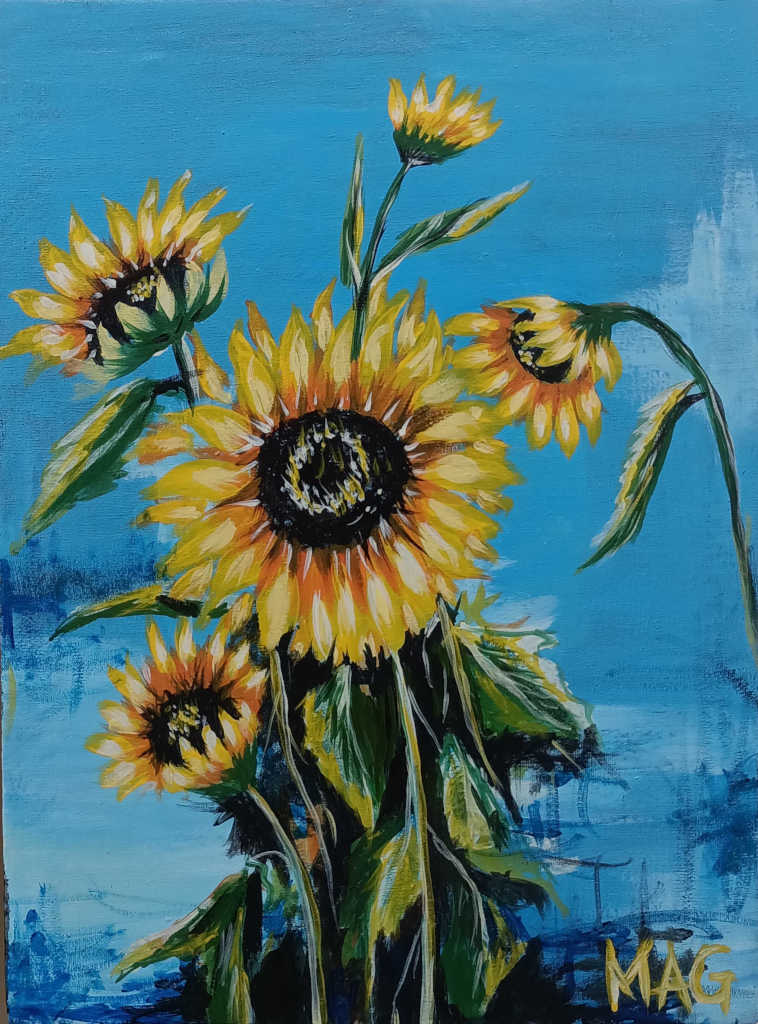 This painting of sunflowers captures the essence of loyalty and adoration through its vibrant hues and graceful composition. Each sunflower, with its golden petals stretching towards the sun, symbolizes unwavering devotion and deep admiration. The rich, warm colors and the intricate details in the petals and stems convey a sense of steadfastness and enduring affection, making this artwork a heartfelt tribute to the beauty of loyal and adoring relationships.